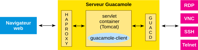 - guacamole-server — Fournit principalement le démon guacd écrit en C qui effectue les connexions vers les machines cibles, sur ordre du client Guacamole. Le côté serveur du client Guacamole communique avec le démon guacd par le protocole Guacamole. La prise en charge des connexions RDP, VNC, SSH, … par guacd s’effectue par l’intermédiaire de modules chargés dynamiquement par le démon.