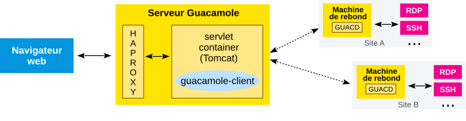 Evidemment ce mode de fonctionnement nécessite que le démon guacd d’un site distant soit accessible depuis le serveur Guacamole. Ce point sort du périmètre de cet article, mais si le routage vers la machine de rebond n’est pas réalisable, un tunnel OpenVPN ou Wireguard peut être utilisé par exemple.